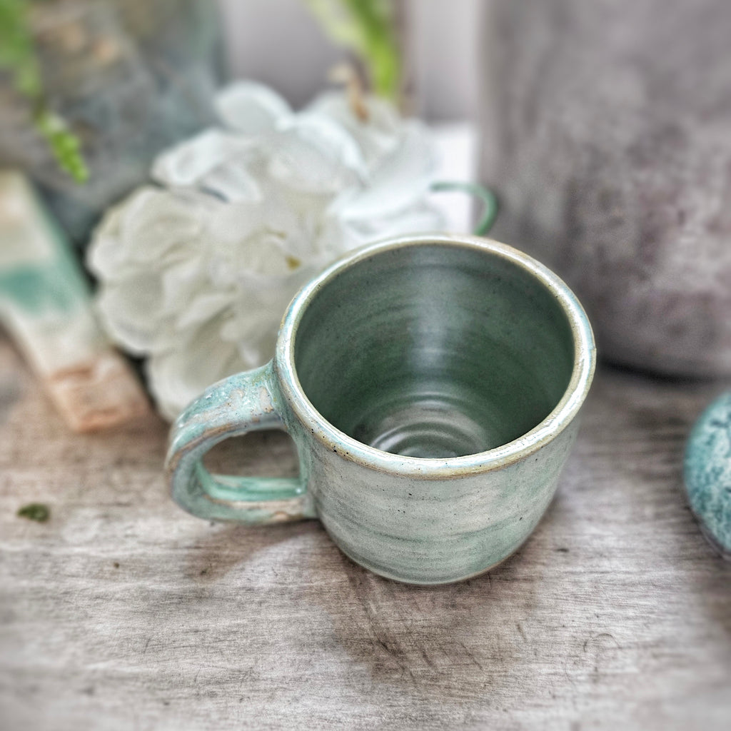 This handcrafted large coffee mug is a gorgeous minty seafood green glaze.