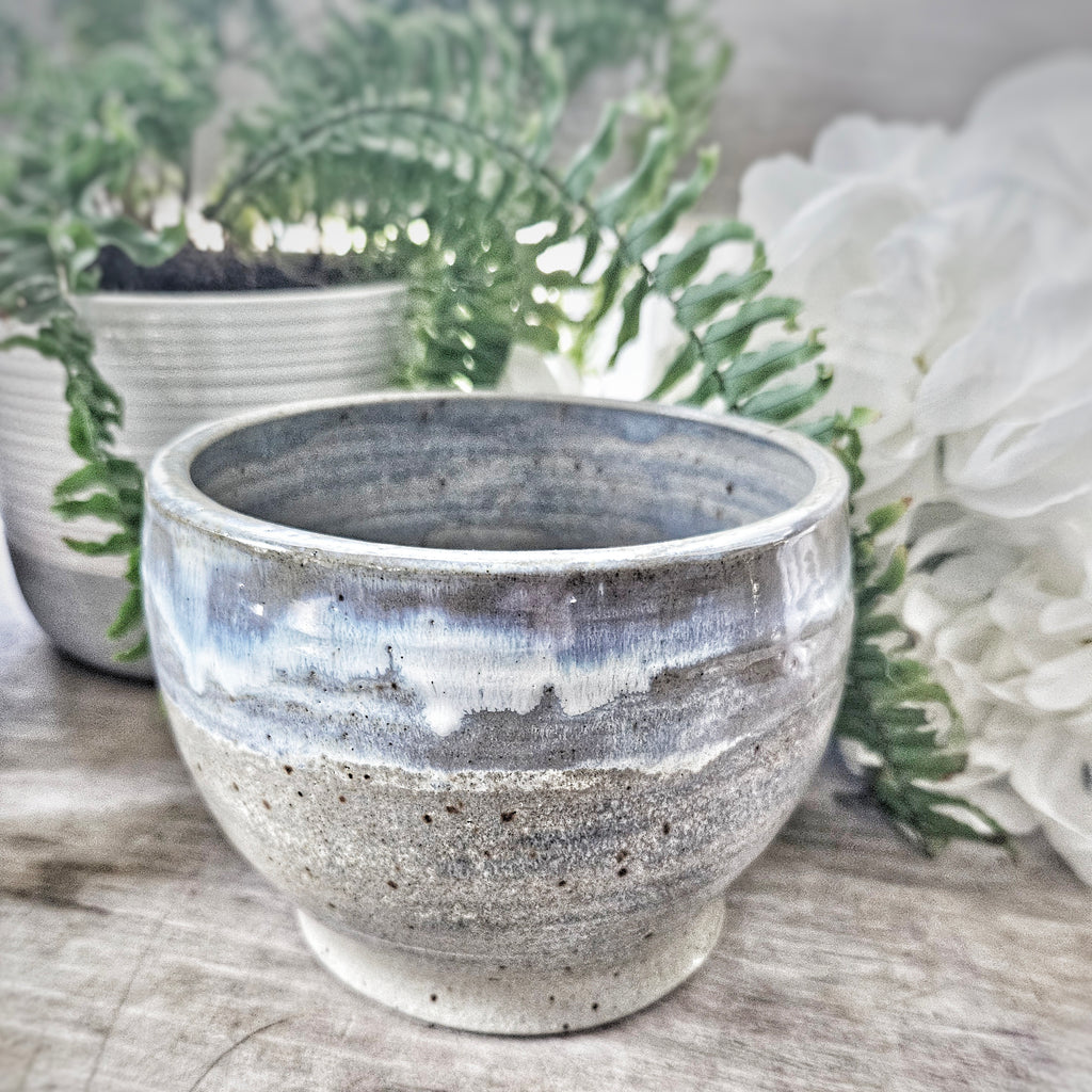This handcrafted Plant pot has a beautiful blues and greys.